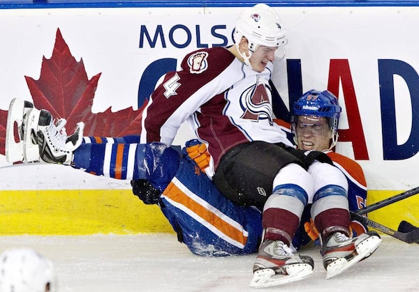 Colorado Avalanche Tyson Barrie (4) checks Edmonton Oilers David Perron (57) during third period NHL hockey action in Edmonton, Alta., on Thursday December 5, 2013.JASON FRANSON/The Canadian Press