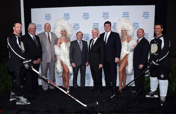 (L-R) Clark County Commissioner Steve Sisolak, Senior Vice President of Arenas for MGM Resorts International Mark Prows, NHL Commissioner Gary Bettman, Fidelity National Financial Inc. Chairman and President of Hockey Vision Las Vegas Bill Foley, Schneider Electronics CMO Chris Hummel, President and CEO of the Las Vegas Convention & Visitors Authority Rossi Ralenkotter are flanked by models in hockey gear during a news conference at the MGM Grand Hotel & Casino announcing the launch of a season ticket drive to try to gauge if there is enough interest in Las Vegas to support an NHL team on February 10, 2015 in Las Vegas, Nevada.Ethan Miller/Getty Images
