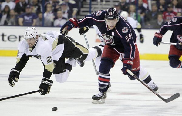 Columbus Blue Jackets' Mark Letestu, right, chases a loose puck as Pittsburgh Penguins' Matt Niskanen falls to the ice during the second period of Game 4 of a first-round NHL hockey playoff series on Wednesday, April 23, 2014.Jay LaPrete/The Associated Press