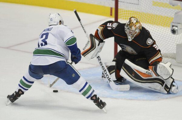 Vancouver Canucks center Nick Bonino (13) moves to attempt a shot on Anaheim Ducks goalie Frederik Andersen (31) which results in the game winning goal during a shootout at Honda Center, Nov. 9, 2014.Kelvin Kuo