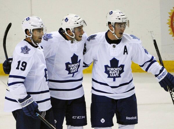 Toronto Maple Leafs Joffrey Lupul, left, and Tyler Bozak, right, celebrate a goal by Josh Leivo, center, against the Buffalo Sabres during the third period of an NHL hockey preseason game, Friday, Sept. 26, 2014, in Buffalo, N.Y. Toronto won 6-4.Gary Wiepert/The Associated Press