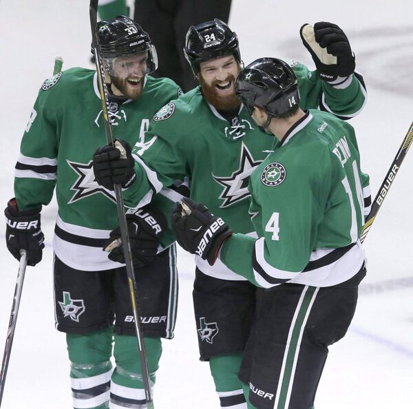 In this 2015 file photo, Dallas Stars left wing Jamie Benn (14) celebrates his goal with teammates Alex Goligoski and Jordie Benn (24) during overtime play of an NHL hockey game against the Vancouver Canucks.LM Otero/The Associated Press