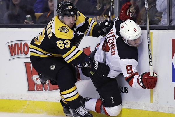 Boston Bruins left wing Brad Marchand checks New Jersey Devils defenceman Will Butcher into the boards during the second period of a game in Boston, on Jan. 23, 2018.Charles Krupa/The Associated Press