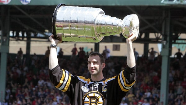 Boston Bruins Zdeno Chara holds up the Stanley Cup during a tribute to the Bruins before an interleague baseball game between the Boston Red Sox and the Milwaukee Brewers in Boston, Sunday, June 19, 2011. (AP Photo/Michael Dwyer)Michael Dwyer/The Associated Press