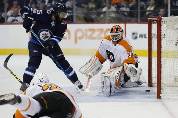 Winnipeg Jets' Mathieu Perreault scores on Philadelphia Flyers goaltender Brian Elliott during the second period in Winnipeg, on Nov. 16, 2017.JOHN WOODS/The Canadian Press