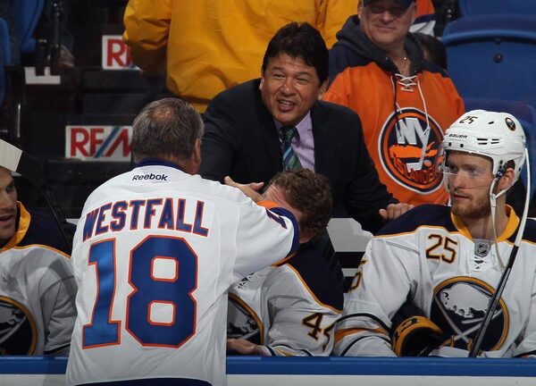Buffalo Sabres former head coach Ted Nolan greets Ed Westfall during the New York Islanders Decades Night at the Nassau Veterans Memorial Coliseum on April 4 in Uniondale, N.Y.Bruce Bennett/Getty Images