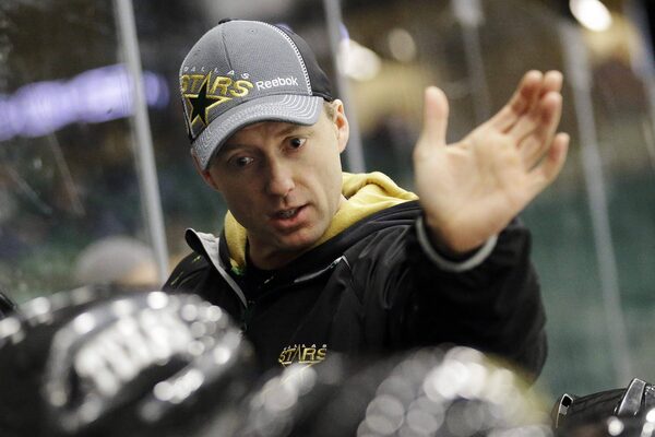 Glen Gulutzan speaks to players on the bench during NHL hockey training camp in Frisco, Texas, Tuesday, Jan. 15, 2013.LM Otero/The Associated Press