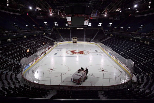 An ice-cleaning machine floods the ice at the Saddledome in Calgary.Jeff McIntosh/The Canadian Press