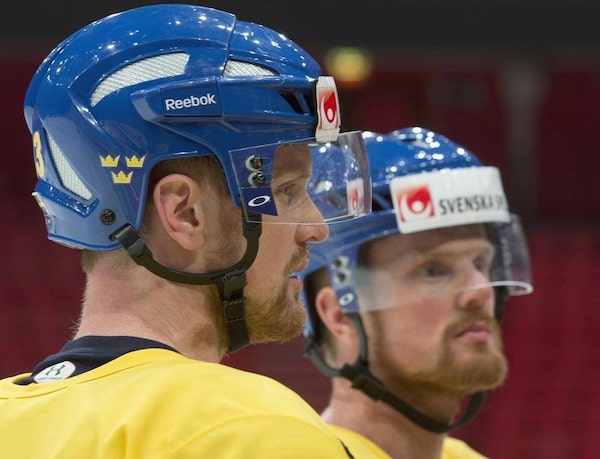 Team Sweden Henrik Sedin, left, and his brother Daniel listen to the coach during a practice session, Wednesday, May 15, 2013 at the world hockey championship in Stockholm Sweden. Sweden will play Canada in the quarter finals Thursday May 16.Jacques Boissinot/The Canadian Press