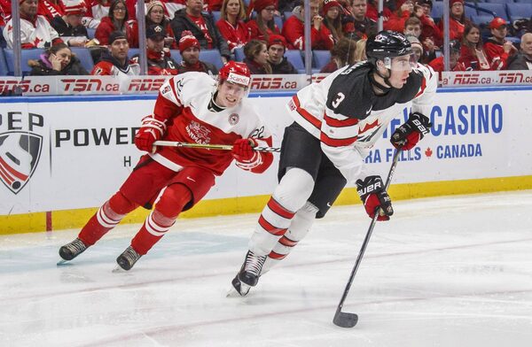 Canada's Conor Timmins (3) carries the puck past Denmark's Andreas Grundtvig during second period IIHF World Junior Championship preliminary action in Buffalo, N.Y., Saturday, December 30, 2017.Mark Blinch/The Canadian Press