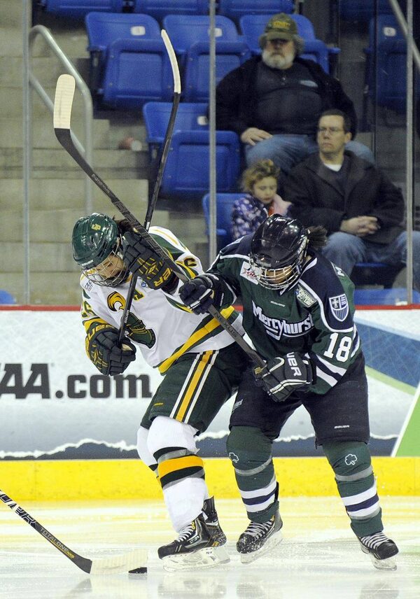 Clarkson's Jamie Lee Rattray, left, fights for a loose puck with Mercyhurst's J'nai Mahadeo during the first period of Clarkson's 5-1 victory in an NCAA college hockey game in the semi-finals of the women's Frozen Four in Hamden, Conn., Friday, March 21.Fred Beckham/The Associated Press