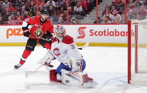 Derick Brassard of the Ottawa Senators looks on as Carey Price of the Montreal Canadiens makes a pad save in overtime at Canadian Tire Centre on March 18, 2017 in Ottawa.Jana Chytilova/Freestyle Photo/Getty Images