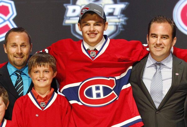 Alex Galchenyuk, center, smiles with officials from the Montreal Canadiens after being chosen third overall in the first round of the NHL draft on Friday, June 22, 2012, in Pittsburgh.Keith Srakocic/The Associated Press