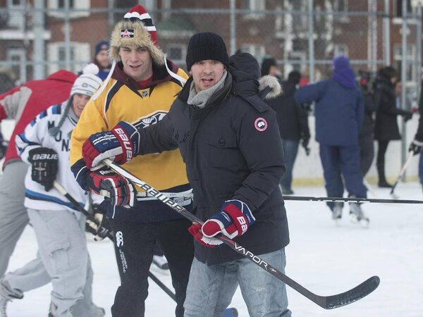 Montreal Canadiens defenceman Josh Gorges, right, watches the play during a game of pick-up hockey in Montreal, Wednesday, December 26, 2012. Gorges used Twitter to organize a Boxing Day outdoor hockey game with fans at a neighbourhood rink in Montreal.Graham Hughes/The Canadian Press