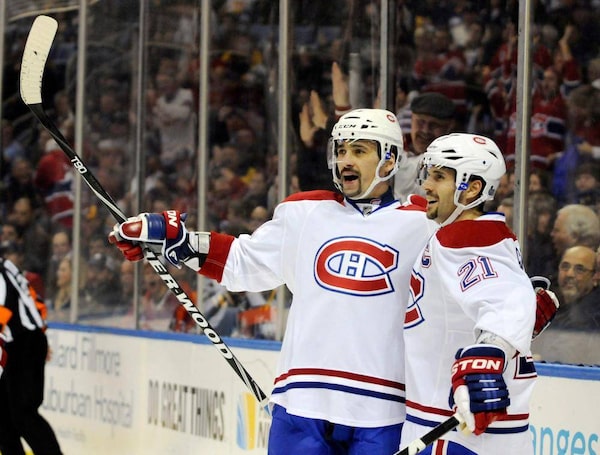 Montreal Canadiens center Tomas Plekanec (L) celebrates a goal with right wing Brian Gionta (21) against the Buffalo Sabres during the first period of their NHL hockey game in Buffalo, New York February 7, 2013.DOUG BENZ/Reuters