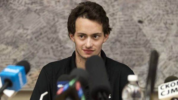 Kootenay Ice forward and Montreal Canadiens prospect Tim Bozon speaks to media regarding his expected release from a Saskatoon hospital after falling ill with meningitis at the beginning of March, in Saskatoon on Friday, March 28, 2014.The Canadian Press