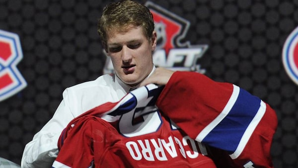 Michael McCarron, a winger, pulls on a Montreal Canadiens sweater after being chosen 25th overall in the first round of the NHL hockey draft, Sunday, June 30, 2013, in Newark, N.J.The Associated Press