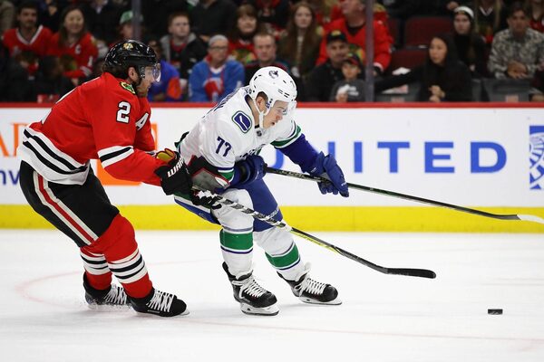 Vancouver Canucks’ Nikolay Goldobin advances the puck in front of Chicago Blackhawks defenceman Duncan Keith at the United Center, in Chicago, on March 22, 2018.Jonathan Daniel