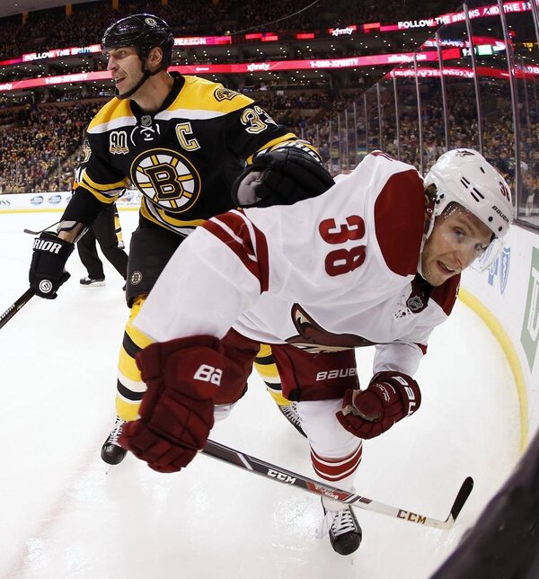 In this photo taken with a fish eye lens, Boston Bruins defenseman Zdeno Chara of Slovakia shoves Phoenix Coyotes' Brandon McMillan (38) into the boards during the third period of Boston's 2-1 win in an NHL hockey game in Boston Thursday, March 13, 2014.Winslow Townson/The Associated Press