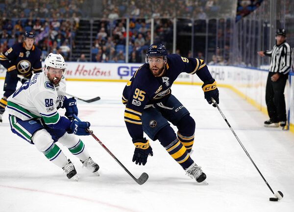 Justin Bailey #95 of the Buffalo Sabres take the puck around Sam Gagner #89 of the Vancouver Canucks during the second period at the KeyBank Center on Oct. 20, 2017 in Buffalo, New York.Kevin Hoffman/Getty Images