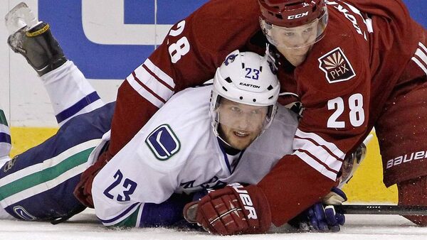 Vancouver Canucks' Alexander Edler is checked to the ice by Phoenix Coyotes' Lauri Korpikoski during the second period of their NHL hockey game in Glendale, Arizona, March 21, 2013.Reuters