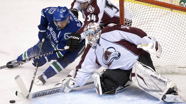 Vancouver Canucks Daniel Sedin (L) is stopped by Colorado Avalanche goalie Peter Budaj during the 2nd period of their NHL hockey game in Vancouver, British Columbia November 24, 2010. REUTERS/Ben NelmsSTRINGER/CANADA/Reuters