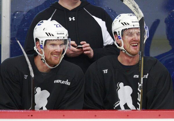 Daniel Sedin #22 and Henrik Sedin #33 of the Vancouver Canucks share a laugh during a practice session with the UBC Thunderbirds hockey team at the University of B.C. in Vancouver January 7, 2013.Jeff Vinnick/The Globe and Mail
