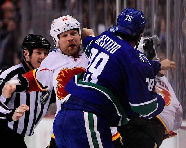 Just two seconds had ticked off the clock when all five skaters from each team taking the opening faceoff dropped their gloves and began throwing punches. Calgary heavyweight Brian McGrattan was left bloodied in a fight with Vancouver tough guy Tom Sestito. After the fight Sestito patted McGrattan on the back of the head.