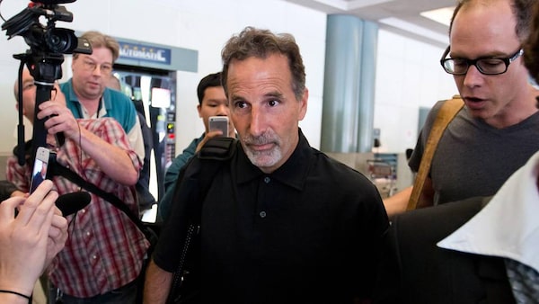Former New York Rangers head coach John Tortorella, centre, walks out a side door to a waiting vehicle upon arrival at the Vancouver International Airport in Richmond, B.C., on Friday June 21, 2013. Numerous media reports are suggesting he will be named head coach of the Vancouver Canucks.The Canadian Press