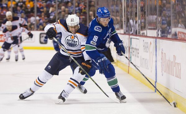 Milan Lucic #27 of the Edmonton Oilers tries to knock Jake Virtanen #18 of the Vancouver Canucks off the puck in NHL action on Oct. 7, 2017 at Rogers Arena in Vancouver.Rich Lam/Getty Images