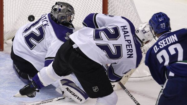 Vancouver Canuck's Daniel Sedin (R) scores on Los Angeles Kings' Jonathan Quick while being checked by Kings' Jeff Halpern during second period action in Game 5 of their NHL Western Conference quarter-final hockey game in Vancouver, British Columbia April 23, 2010. REUTERS/Lyle StaffordLYLE STAFFORD/Reuters