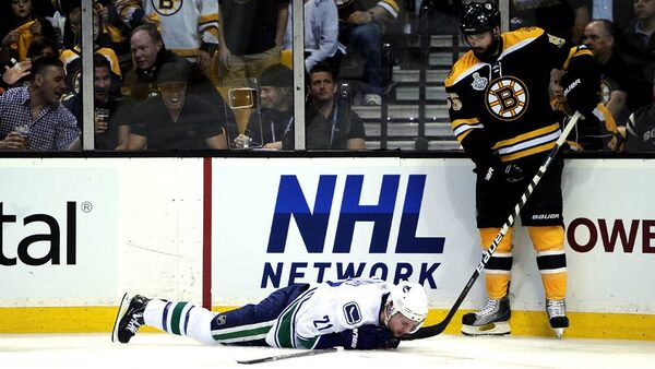 Mason Raymond of the Vancouver Canucks lays on the ice after being checked by Johnny Boychuk of the Boston Bruins.Harry How