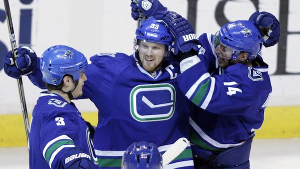 Vancouver Canucks' Henrik Sedin, centre, celebrates his goal against the Edmonton Oilers with teammates Kevin Bieksa, left, and Alex Burrows during the second period of their NHL hockey game in Vancouver on Saturday.BEN NELMS