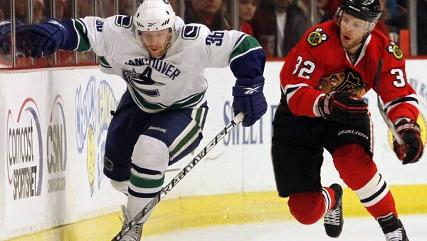 Vancouver Canucks' Jannik Hansen, left, skates past Chicago Blackhawks' Kris Versteeg during the first period of Game 1 of an NHL hockey Western Conference second-round playoff series Saturday, May 1, 2010, in Chicago. (AP Photo/Nam Y. Huh)Nam Y. Huh/The Associated Press