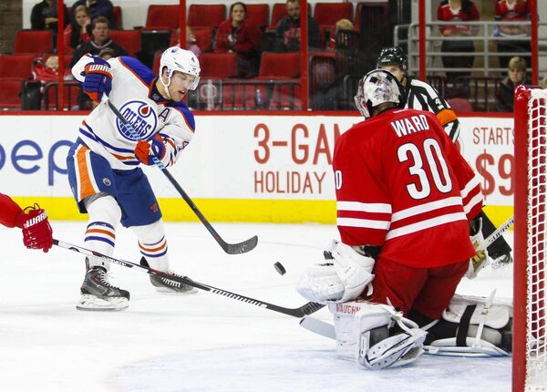 Edmonton Oilers forward Taylor Hall (4) 3rd period shot is stopped by Carolina Hurricanes goalie Cam Ward (30) at PNC Arena in Raleigh, NC. The Carolina Hurricanes defeated the Edmonton Oilers 4-1.James Guillory