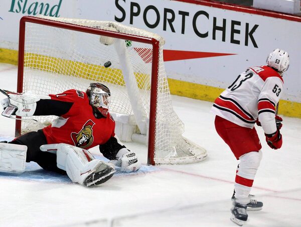 McGinn had a great tip in the slot off a Klas Dahlbeck point shot to beat Condon through the legs, but the Senators challenged saying the Hurricanes had gone offside prior to the goal.