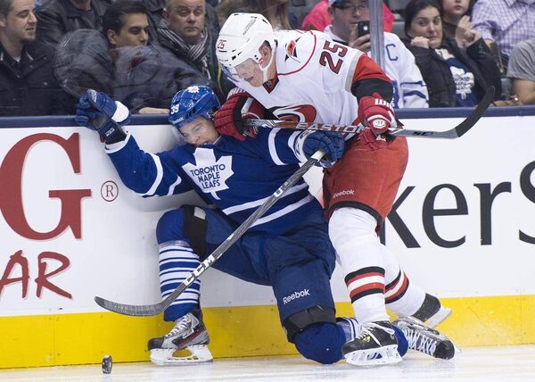 Toronto Maple Leafs forward Matt Frattin gets taken out by Carolina Hurricanes defenceman Joni Pitkanen during a March 28 gameNathan Denette/The Canadian Press