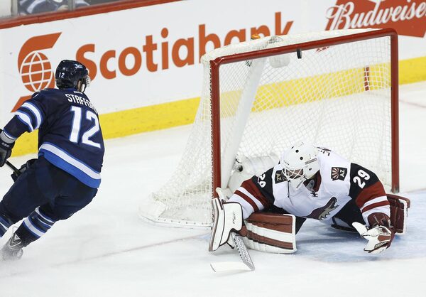 Winnipeg Jets' Drew Stafford (12) beats Arizona Coyotes' goaltender Anders Lindback (29) but goes off the crossbar during third period NHL action, in Winnipeg, on Saturday, Nov. 21, 2015.JOHN WOODS/The Canadian Press