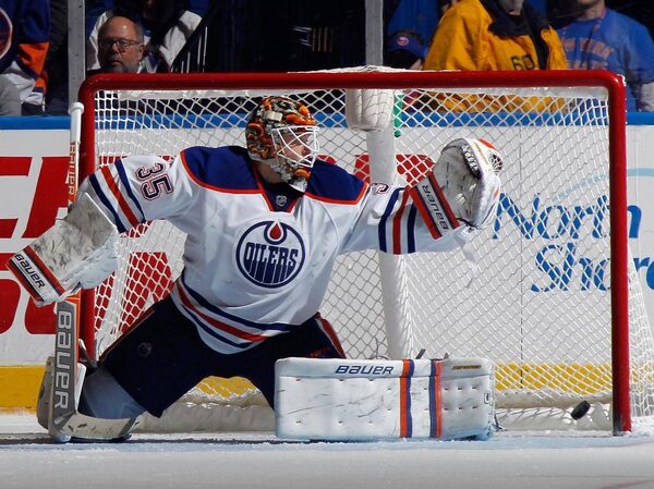 The game winning shot by Casey Cizikas #53 of the New York Islanders eludes Viktor Fasth #35 of the Edmonton Oilers at 15:23 of the third period at the Nassau Veterans Memorial Coliseum on February 10, 2015 in Uniondale, New York. The Islanders defeated the Oilers 3-2.Bruce Bennett/Getty Images