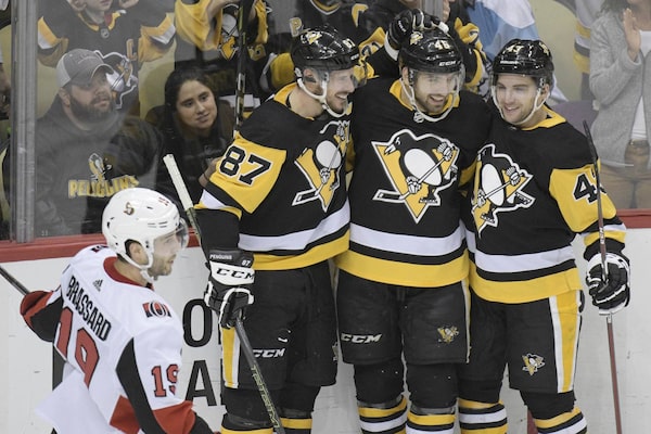 Pittsburgh Penguins centre Zach Aston-Reese celebrates with Sidney Crosby and Conor Sheary after scoring his first NHL goal against the Ottawa Senators during the second period at PPG PAINTS Arena in Pittsburgh, on Feb 13, 2018.Don Wright