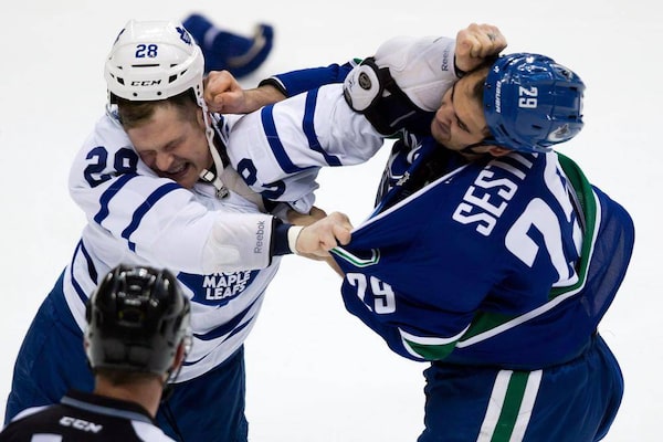 Toronto Maple Leafs' Colton Orr, left, and Vancouver Canucks' Tom Sestito fight during second period NHL hockey action in Vancouver, B.C., on Saturday November 2, 2013.DARRYL DYCK/The Canadian Press