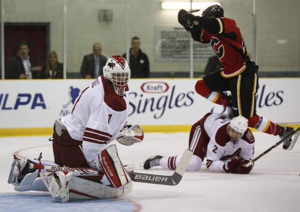 Arizona Coyotes goalie Brendan Burke watches a shot go wide as Calgary Flames Josh Jooris crashes over Coyotes Jamie McBainJeff McIntosh/The Canadian Press
