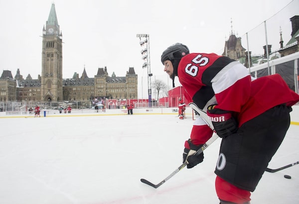 Ottawa Senators defenceman Erik Karlsson waits for a pass during a practice on the Parliament Hill ice rink Dec, 15, 2017 in Ottawa.Adrian Wyld/The Globe and Mail