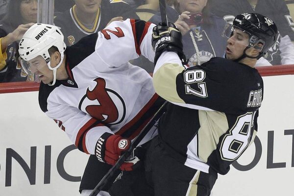 Pittsburgh Penguins' Sidney Crosby (87) collides with New Jersey Devils' Marek ZidlickyGENE J. PUSKAR/The Associated Press