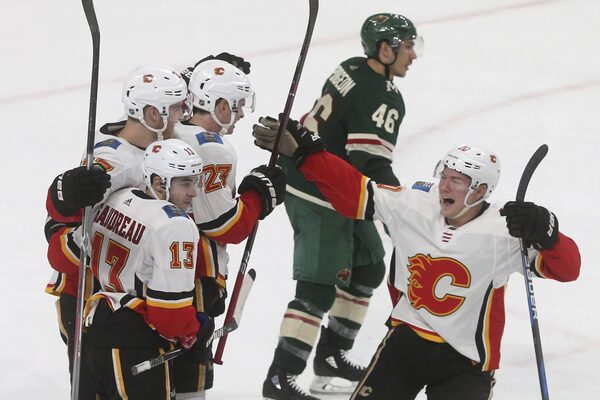 After Smith stopped Ryan Suter on a breakaway, Gaudreau outraced Jason Zucker to the puck going the other way. Gaudreau waited and fed Hamilton for a one-timer.