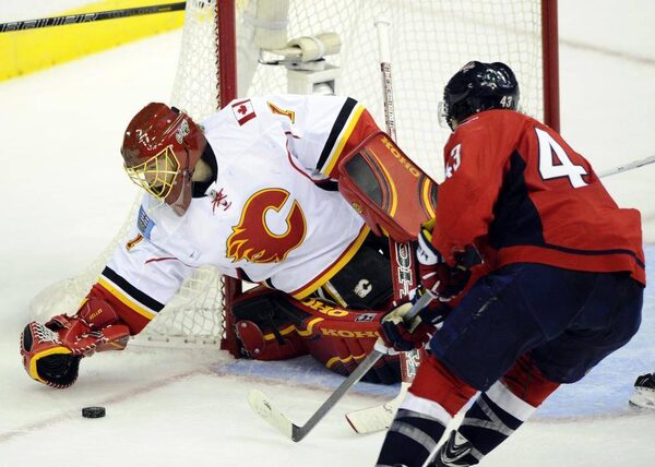 Calgary Flames goalie Jonas Hiller (1), of Switzerland, reaches for the puck against Washington Capitals right wing Tom Wilson (43) during the third period of an NHL hockey game, Tuesday, Nov. 4, 2014, in Washington. The Flames won 4-3 in overtime.The Associated Press