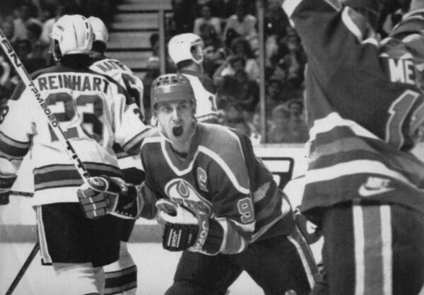 Edomton Oiler Wayne Gretzky and teammate Mark Messier(L) celebrate after Messier's goal against the Calgary Flames April 21, 1988.Pat Price/Reuters