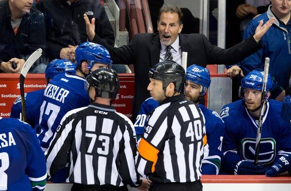 Vancouver Canucks' head coach John Tortorella, top, argues with referee Steve Kozari, 40, and linesman Vaughan Rody, 73, during second period NHL action against the Los Angeles Kings in Vancouver, B.C., on Monday November 25, 2013.DARRYL DYCK/The Canadian Press