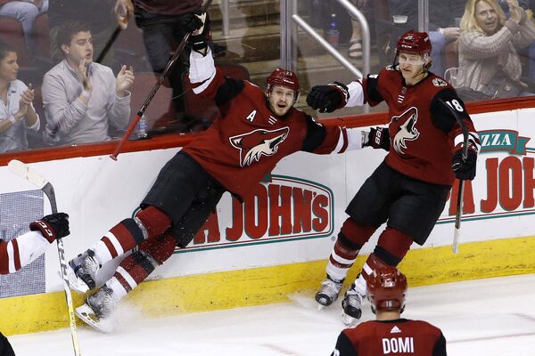 Arizona Coyotes defenseman Oliver Ekman-Larsson, left, celebrates his goal against the Calgary Flames during the third period of an NHL hockey game, Monday, March 19, 2018, in Glendale, Ariz.Ross D. Franklin