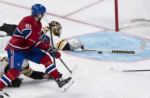 Montreal Canadiens' Lars Eller scores on Boston Bruins goalie Tuukka Rask during first period NHL playoff hockey action on May 12 in Montreal.Paul Chiasson/The Canadian Press